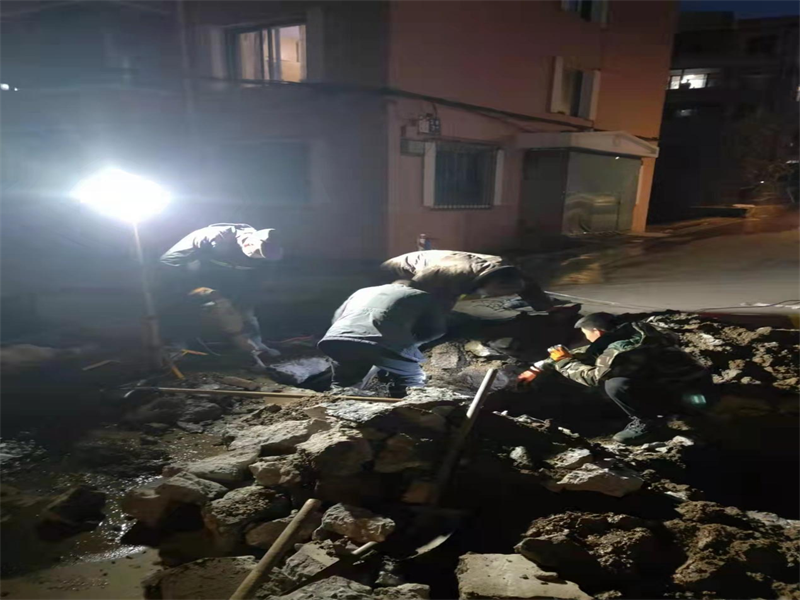 11月17日,宏業(yè)小街區(qū)域出現(xiàn)漏點。營業(yè)三分公司維修人員趕到現(xiàn)場后發(fā)現(xiàn),該區(qū)域地處坡路,屬于商混路面,地面厚,而且還在供暖管下方,測漏人員很難定準漏點,要把整個路面破開才能找到漏點。由于開裂處地理位置特殊,打電鎬難度大,給施工造成困難。搶修人員相互配合,輪換跳入滿是積水的泥坑進行搶修作業(yè)。刺骨的冰水浸透了衣服,泥水沒過膝蓋,他們顧不上嚴寒的侵襲,一刻也不放松搶修的進度。大家堅守在搶修第一線。餓了,啃幾口干糧;困了,就輪流打個盹,爬起來繼續(xù)干??恐@種工作態(tài)度,大家從下午3點開始,經(jīng)過9個多小時持續(xù)不間斷奮戰(zhàn),漏點修復,到晚上近11點才維修完畢,恢復供水!