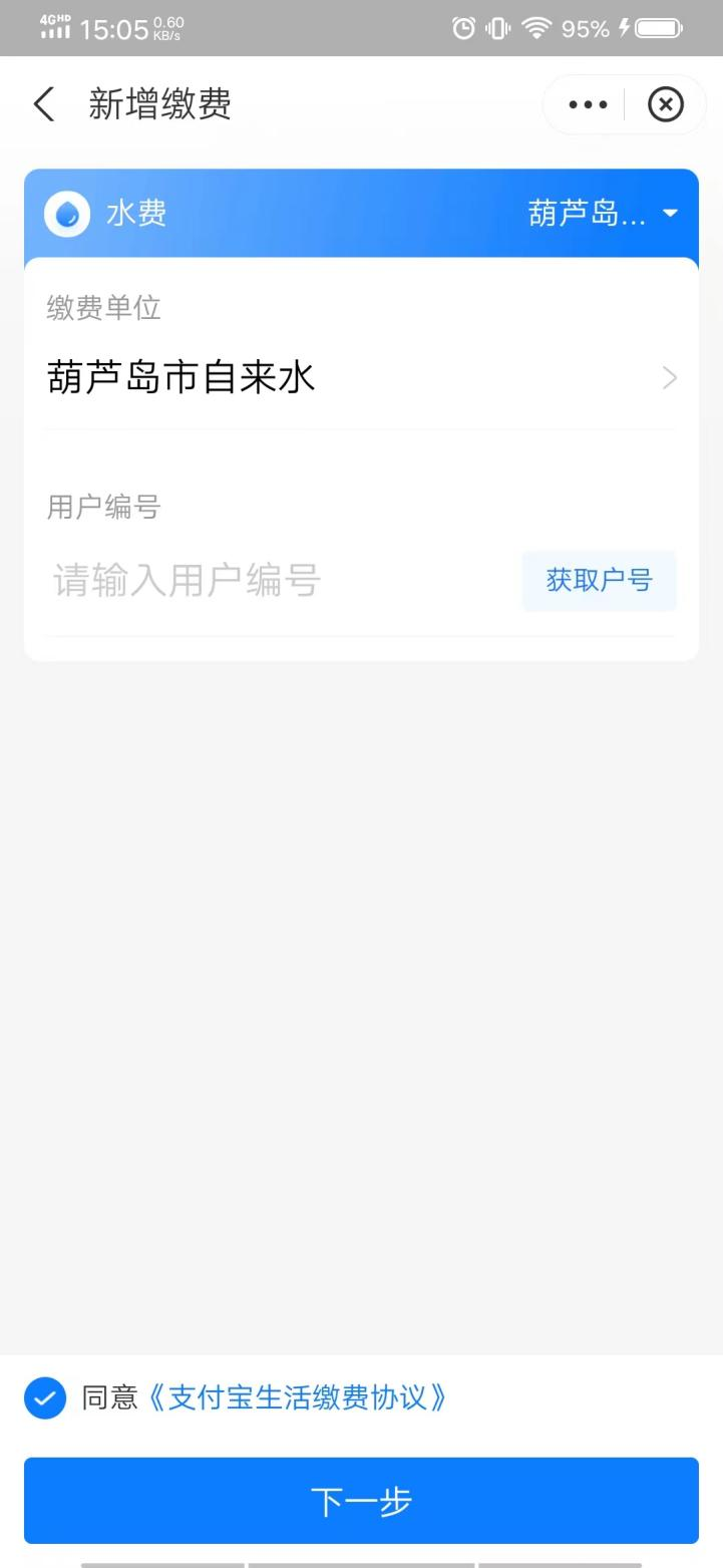 點(diǎn)擊繳費(fèi)單位(葫蘆島市自來水公司)—輸入用戶編號—點(diǎn)擊下方同意—填寫家庭住址