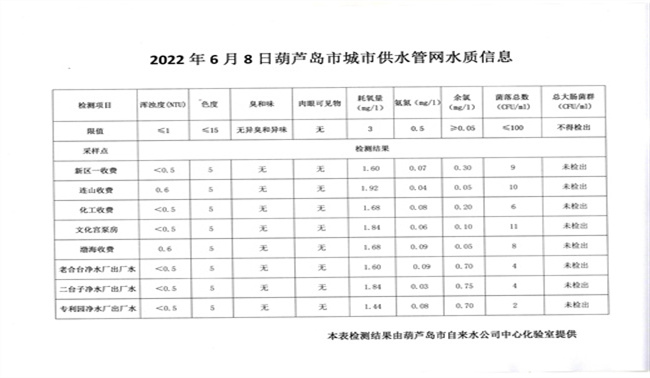2022年6月8日葫蘆島市城市供水管網(wǎng)水質(zhì)信息