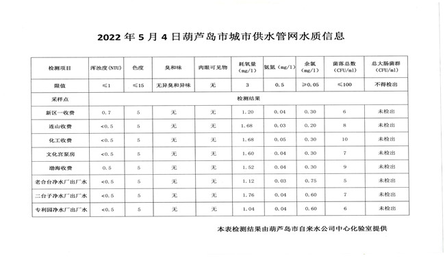 2022年5月4日葫蘆島市城市供水管網(wǎng)水質(zhì)信息