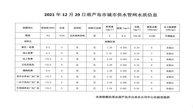 2021年12月29日葫蘆島市城市供水管網(wǎng)水質(zhì)信息