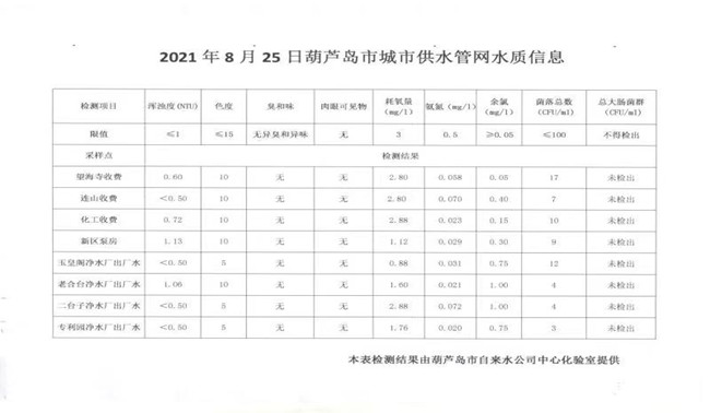 2021年8月25日葫蘆島市城市供水管網(wǎng)水質(zhì)信息