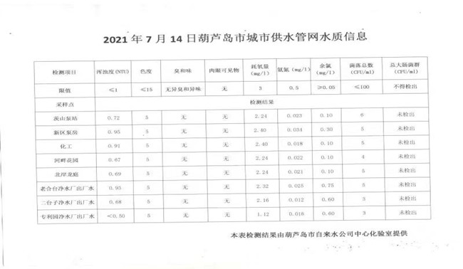 2021年7月14日葫蘆島市城市供水管網(wǎng)水質(zhì)信息