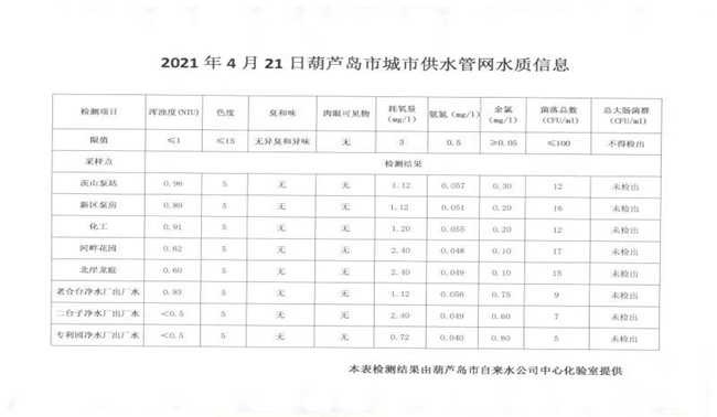 2021年4月21日葫蘆島市城市供水管網(wǎng)水質(zhì)信息