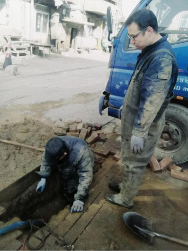 正月初二9:30,營業(yè)第二分公司接到用戶報修電話,反映教育園區(qū)B區(qū)73號樓前供水管線漏水。值班維修人員高峰、張良、張少輝第一時間趕赴現(xiàn)場,當即投入到緊張的搶修當中。尋找漏點需要破除冰層、挖掘凍土。為了搶時間,他們用鐵鎬、鐵鍬手工輔助除冰、破土。在室外溫度-15℃的工作環(huán)境下,經(jīng)過兩個小時的挖掘,終于找到漏點,順利完成維修。