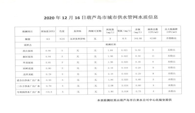 2020年12月16日葫蘆島市城市供水管網(wǎng)水質(zhì)信息