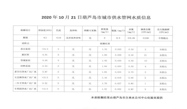 2020年10月21日葫蘆島市城市供水管網(wǎng)水質(zhì)信息
