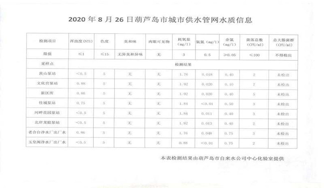 2020年8月26日葫蘆島市城市供水管網(wǎng)水質信息