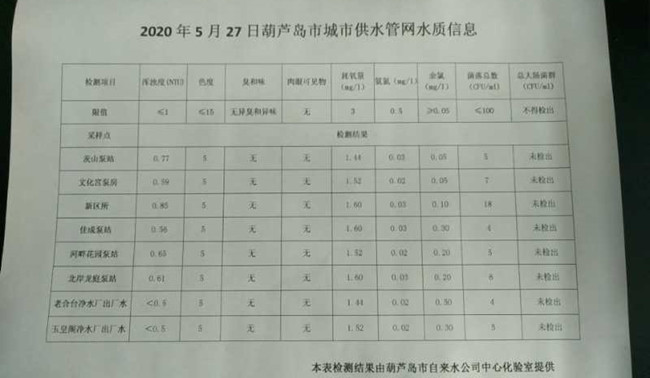 2020年5月27日葫蘆島市城市供水管網(wǎng)水質(zhì)信息