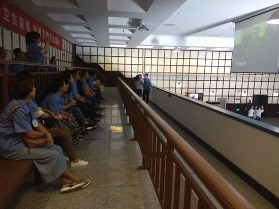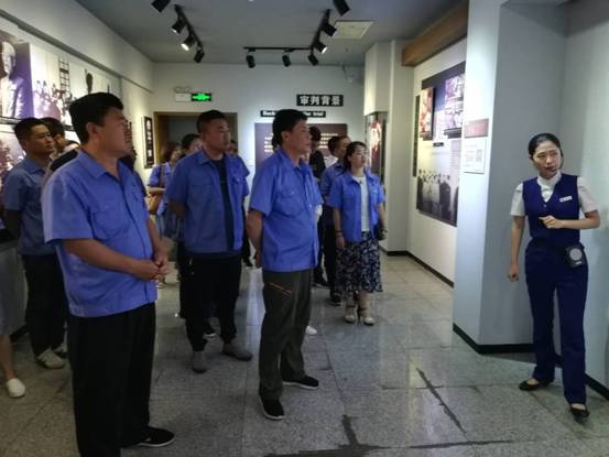 活動的第一站是沈陽審判日本戰(zhàn)犯特別軍事法庭舊址。據(jù)講解員介紹,它是新中國在1956年審判日本戰(zhàn)犯的法庭遺址。陳列展覽包括文字、照片、史料,文物、多媒體演示等展覽形式。展覽共分為“審判背景” “審判準備”“莊嚴審判”“尾聲”等四個部分,全面展示了日本戰(zhàn)犯在沈陽接受審判的整個過程,重現(xiàn)了1956年中國政府成立特別軍事法庭,對日陸軍中將師團長鈴木啟久、偽滿洲國國務(wù)院總務(wù)長官武部六藏等36名戰(zhàn)犯進行審判的歷史場景。黨員們在現(xiàn)場莊嚴地舉起右拳,面對黨旗宣誓,重溫入黨誓詞,一起回顧入黨初心。宣誓結(jié)束后,隨同講解員參觀了各個展廳及復(fù)原的公審日本戰(zhàn)犯場景蠟像,觀看了公審日本戰(zhàn)犯的影像紀錄片,這場令中國人民揚眉吐氣的審判,讓大家深刻感受到了中國對待日本戰(zhàn)犯的寬大胸懷,對祖國的敬佩之心油然而生。