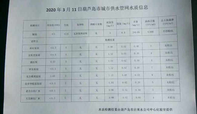 2020年3月11日葫蘆島市城市供水管網(wǎng)水質(zhì)信息
