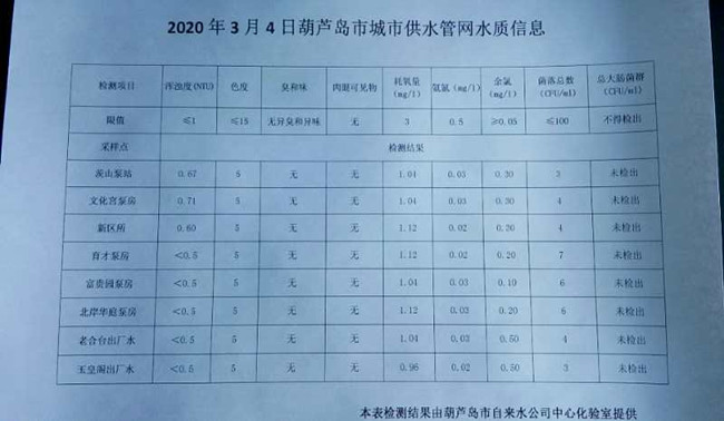 2020年3月4日葫蘆島市城市供水管網(wǎng)水質(zhì)信息