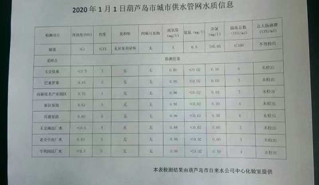 2020年1月1日葫蘆島市城市供水管網(wǎng)水質(zhì)信息