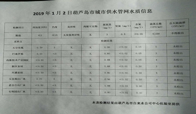2019年1月2日葫蘆島市城市供水管網(wǎng)水質(zhì)信息